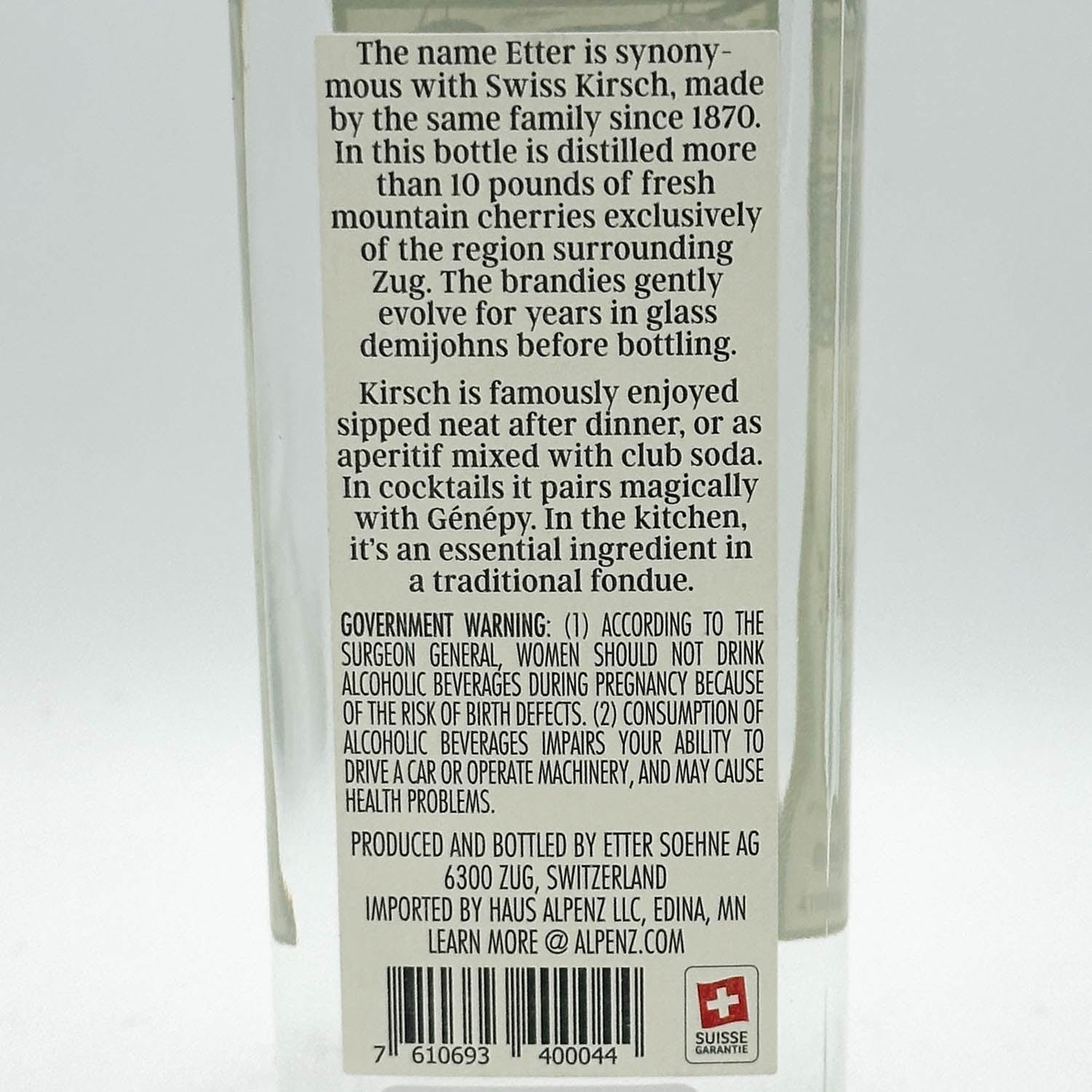 The Etter family has produced Eau-de-Vie in the Swiss Alps since 1870. Kirsch is an eau-de-vie (unaged fruit brandy) made from cherries and there are over 100 different types of Kirsch made in Switzerland. It is essentially the national beverage there much as Scotch is for Scotland.