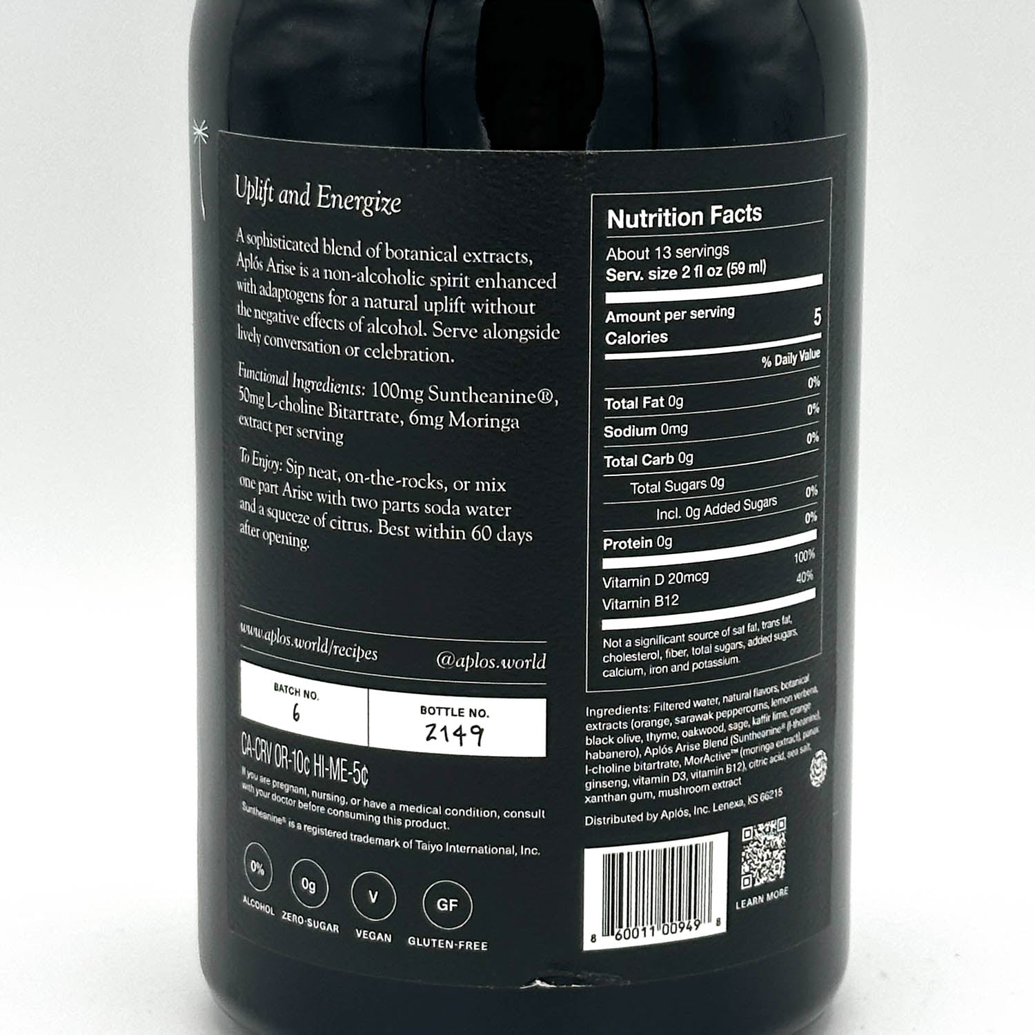 Full Ingredients: Filtered Water, Natural Flavors and Extracts, Aplós Arise Blend (Suntheanine® (L-Theanine), L-Choline Bitartrate, MorActive™(Moringa Extract), Panax Ginseng, VitaminD3, Vitamin B12), Citric Acid, Potassium Citrate, Sea Salt, Xanthan Gum, mushroom extract as preservative