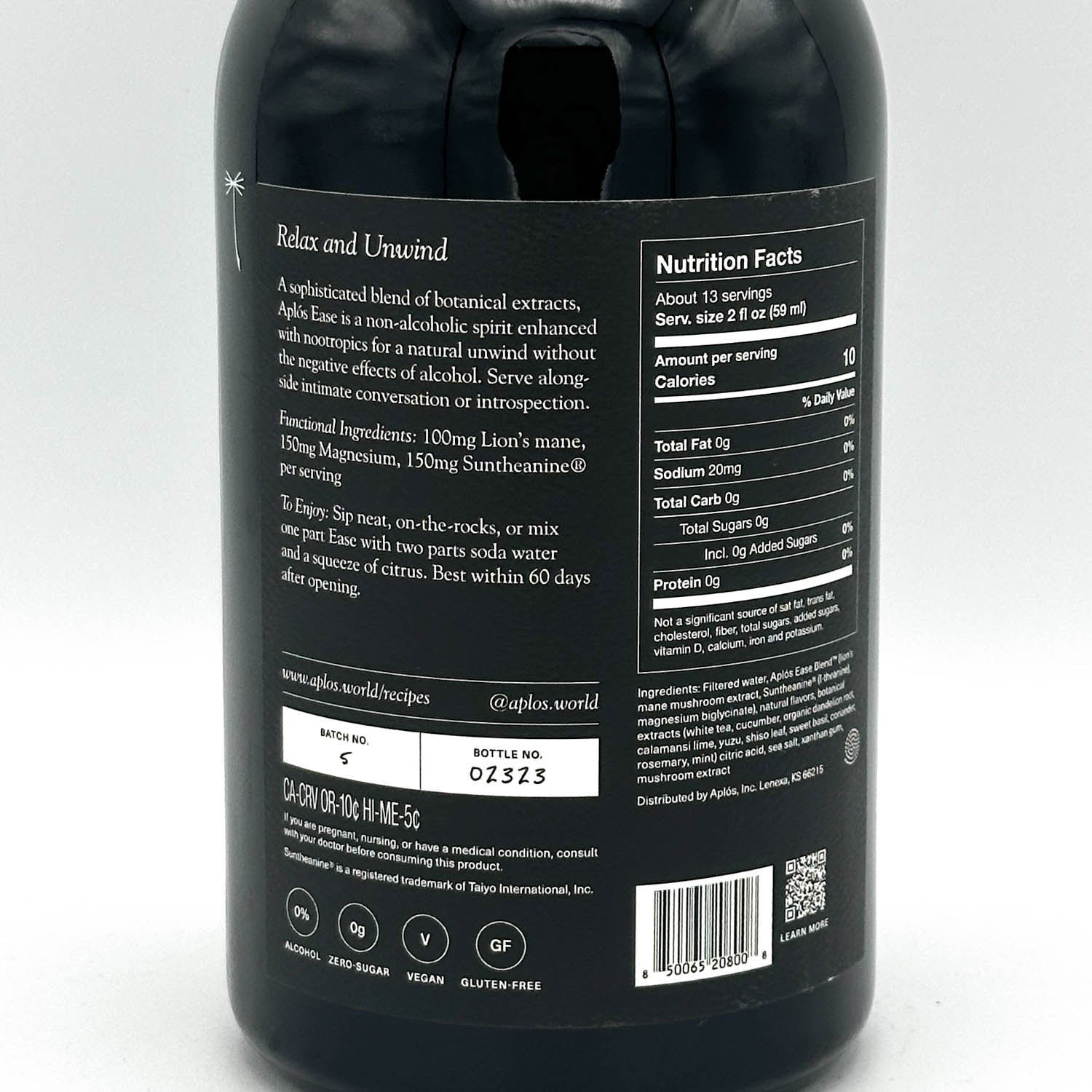 Ingredients: Filtered water, Aplós Ease Blend™ (lion's mane mushroom extract, Suntheanine® (l-theanine), magnesium glycinate), natural flavors, citric acid, organic dandelion extract, potassium citrate, sea salt, xanthan gum, mushroom extract as preservative