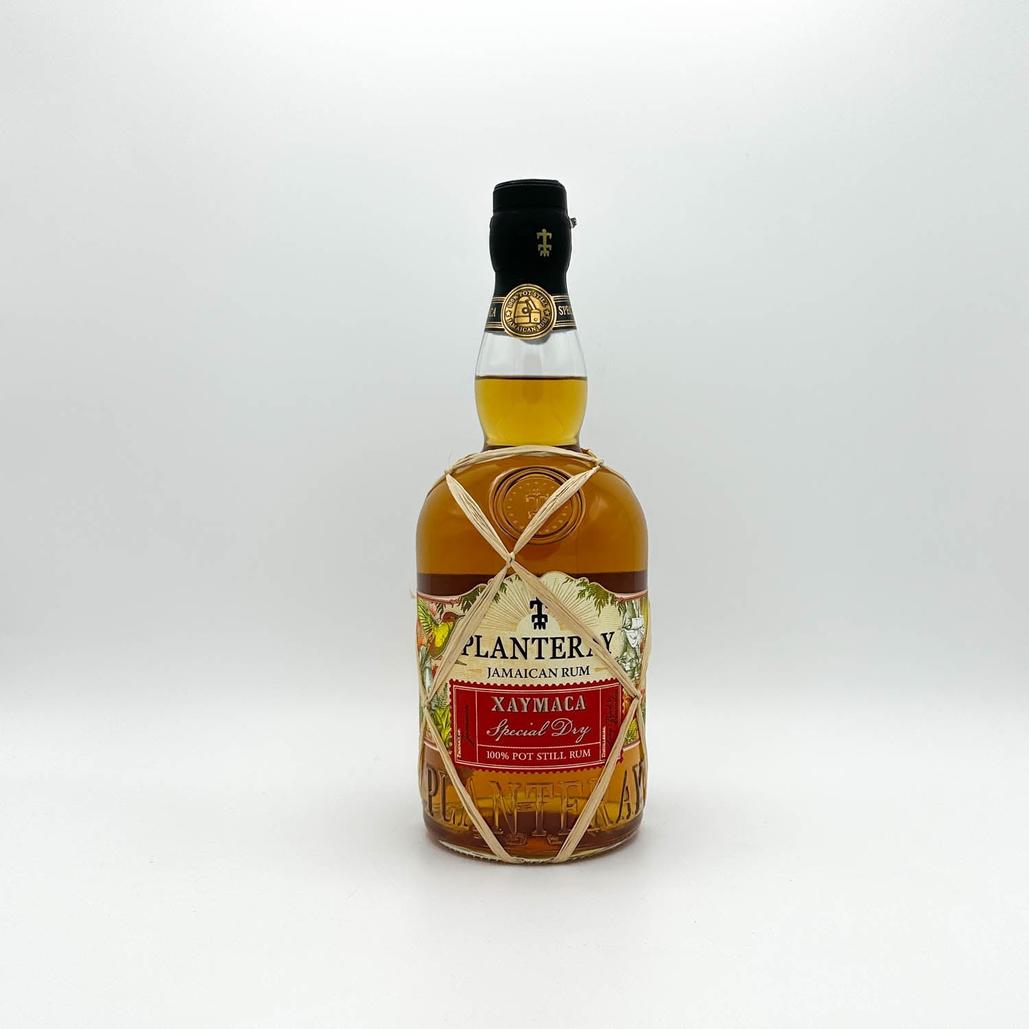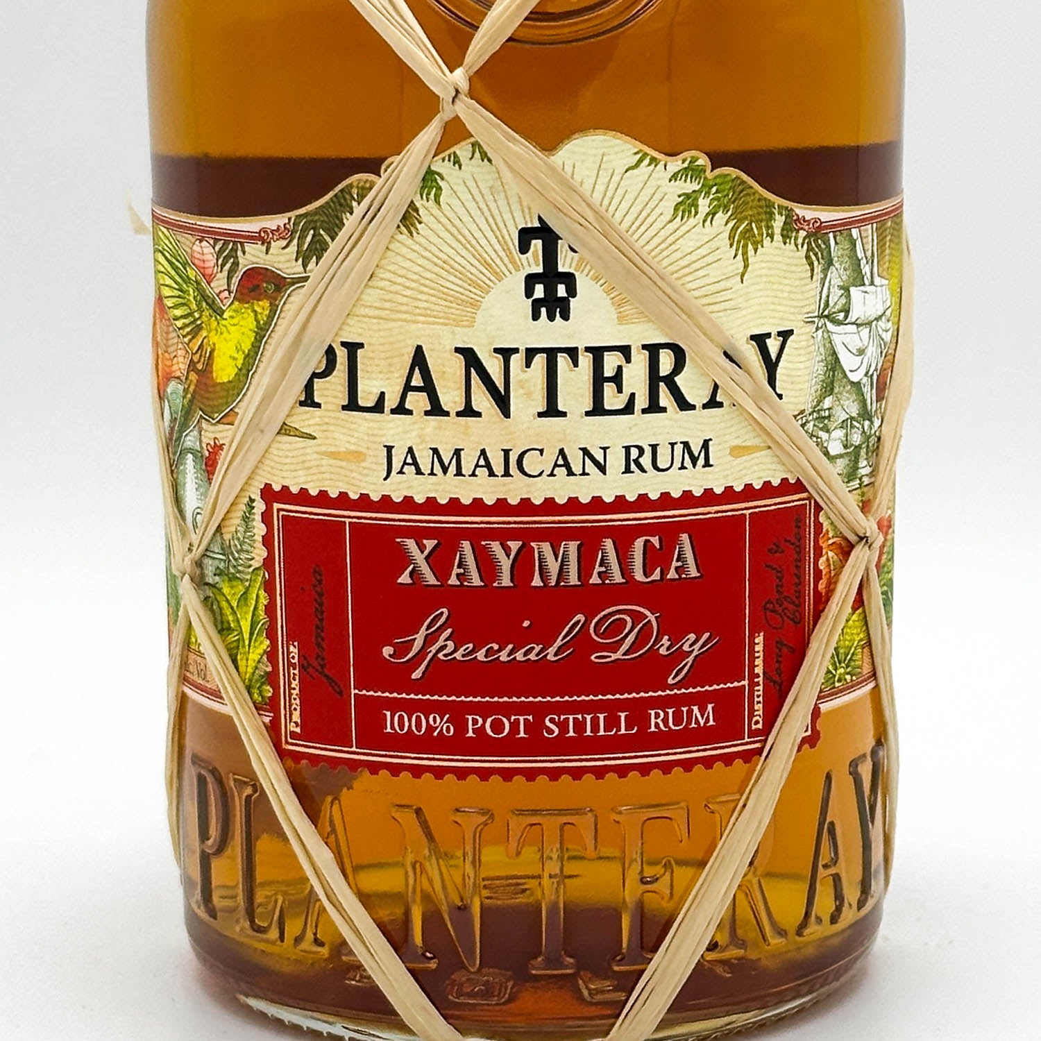 Bottle of Planters Y Cayama Jamaican Rum with decorative string on a white background