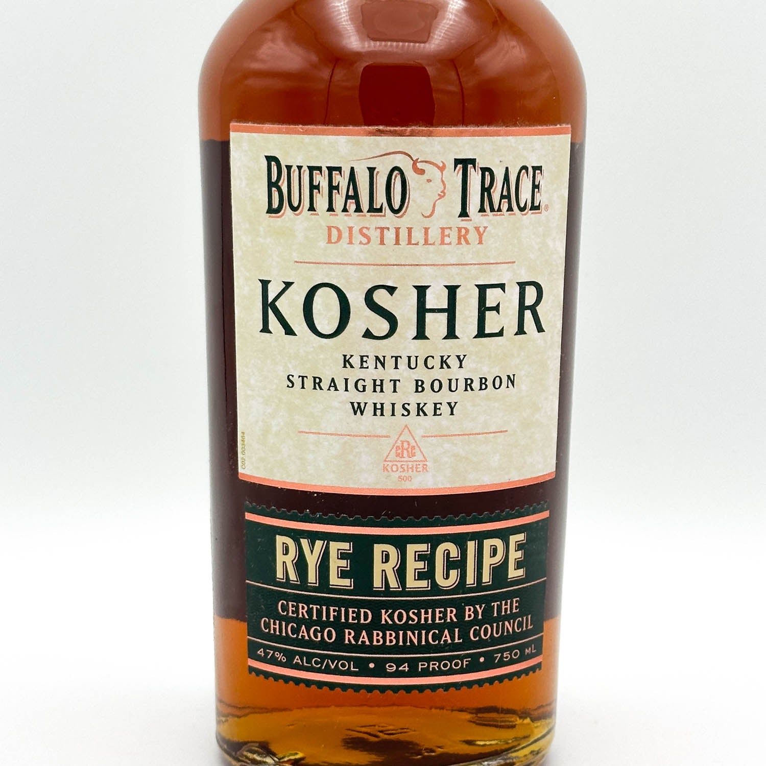 Certified Kosher by the Chicago Rabbinical Council. Made with the same grains as those used in Buffalo Trace Bourbon, this whiskey was aged in specifically designated Kosher barrels. Not technically Kosher for Passover. Aged for 7 years and bottled at 94 proof.