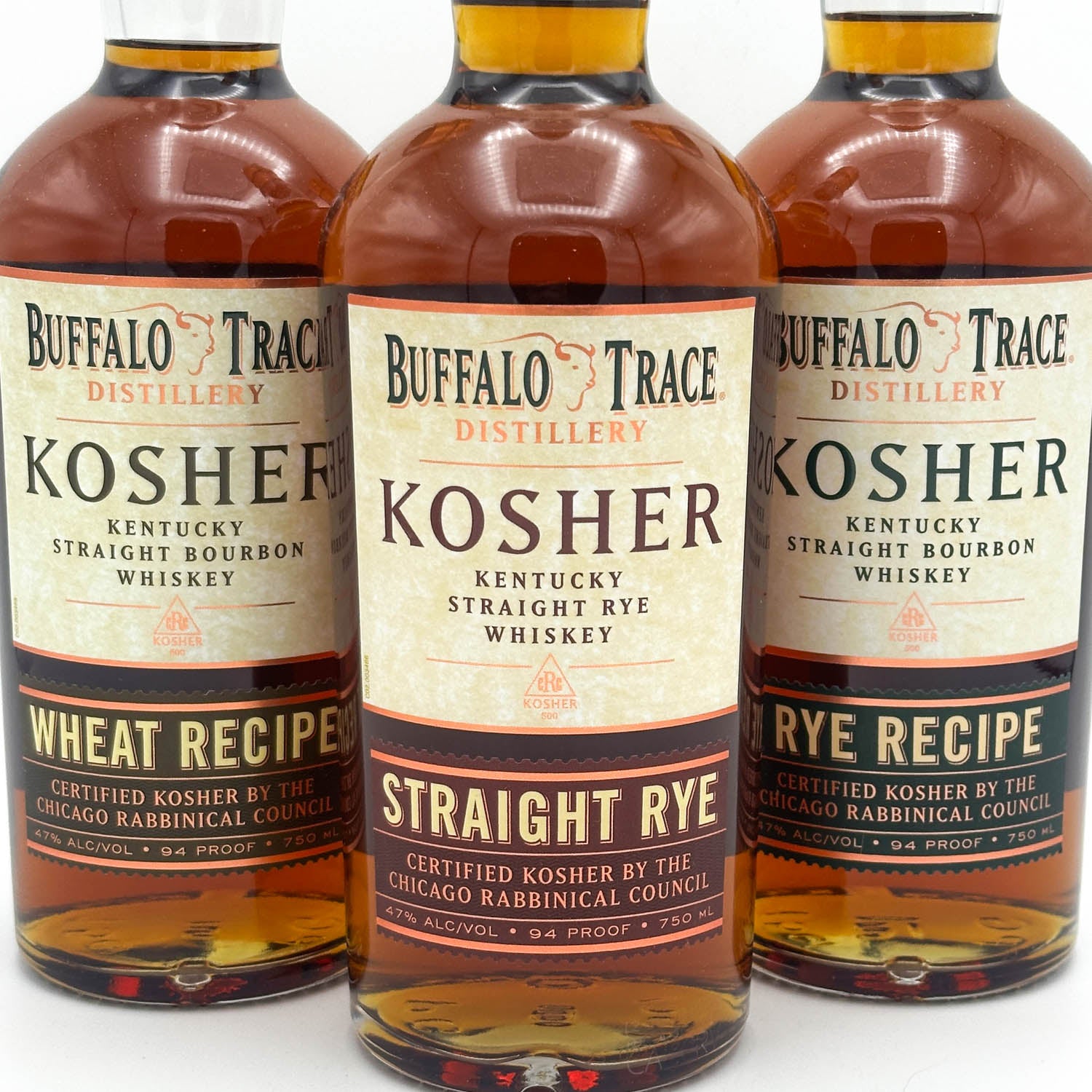Certified Kosher by the Chicago Rabbinical Council. 1 bottle each of the Kosher Wheat Recipe Bourbon, Rye Recipe Bourbon, and Straight Rye. Made with the same grains as those used in the WL Weller and Pappy Van Winkle Bourbons (Wheat Recipe) Buffalo Trace (Rye Recipe), and Sazerac Rye (Straight Rye). These whiskies were each aged in specifically designated Kosher barrels. Not technically Kosher for Passover. Aged for 7 years and bottled at 94 proof.